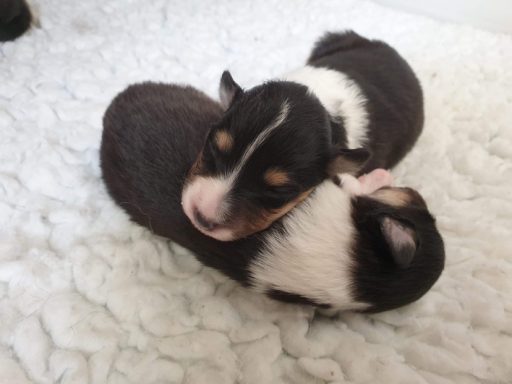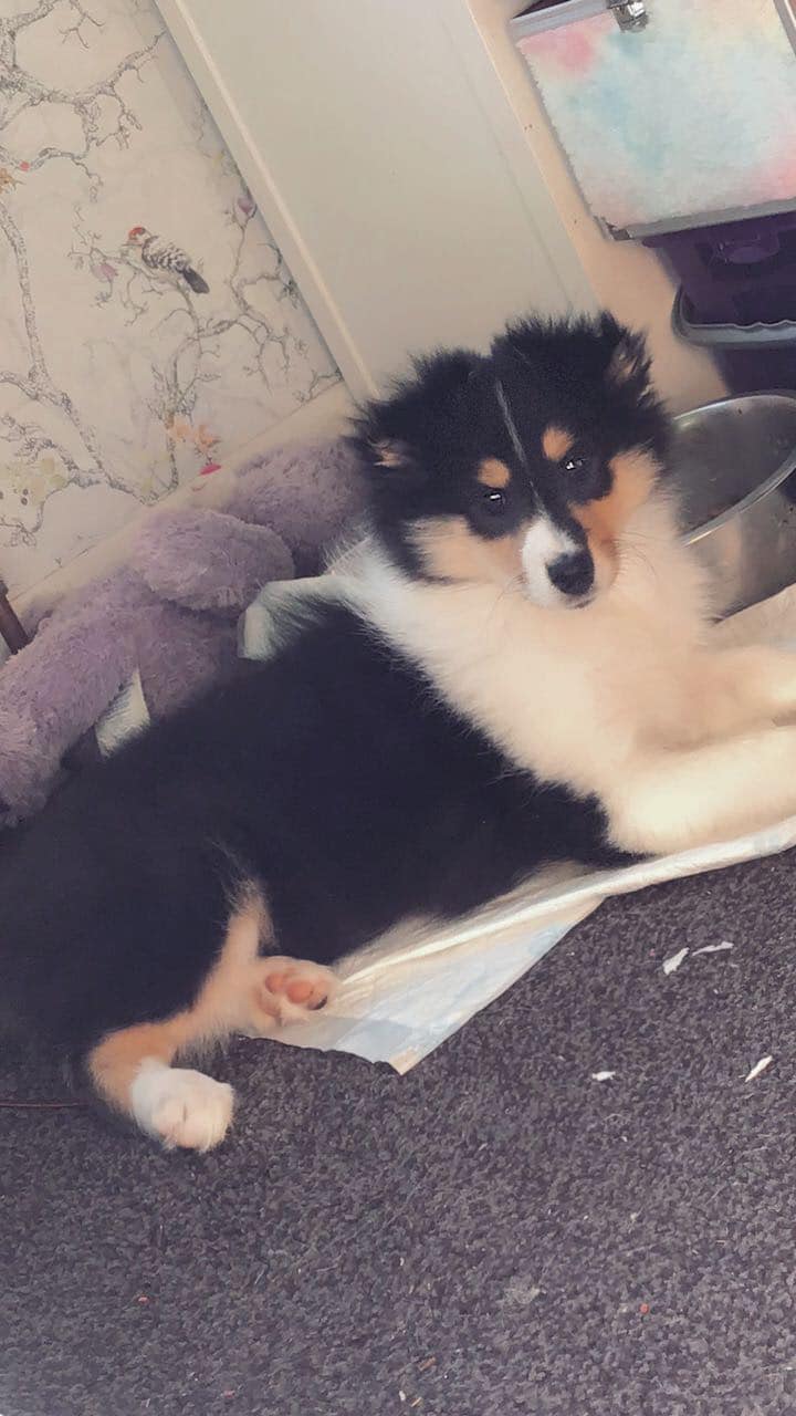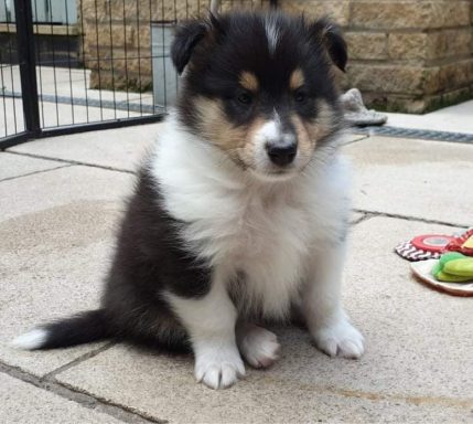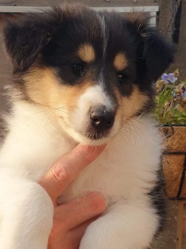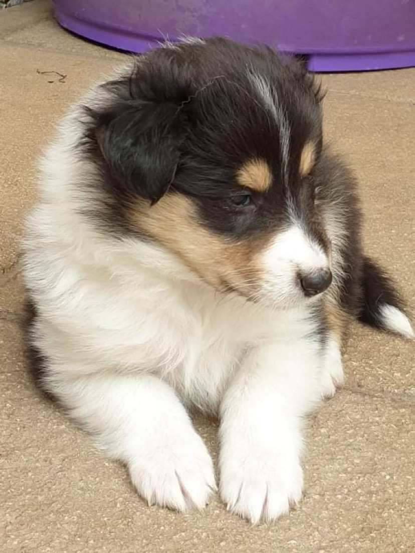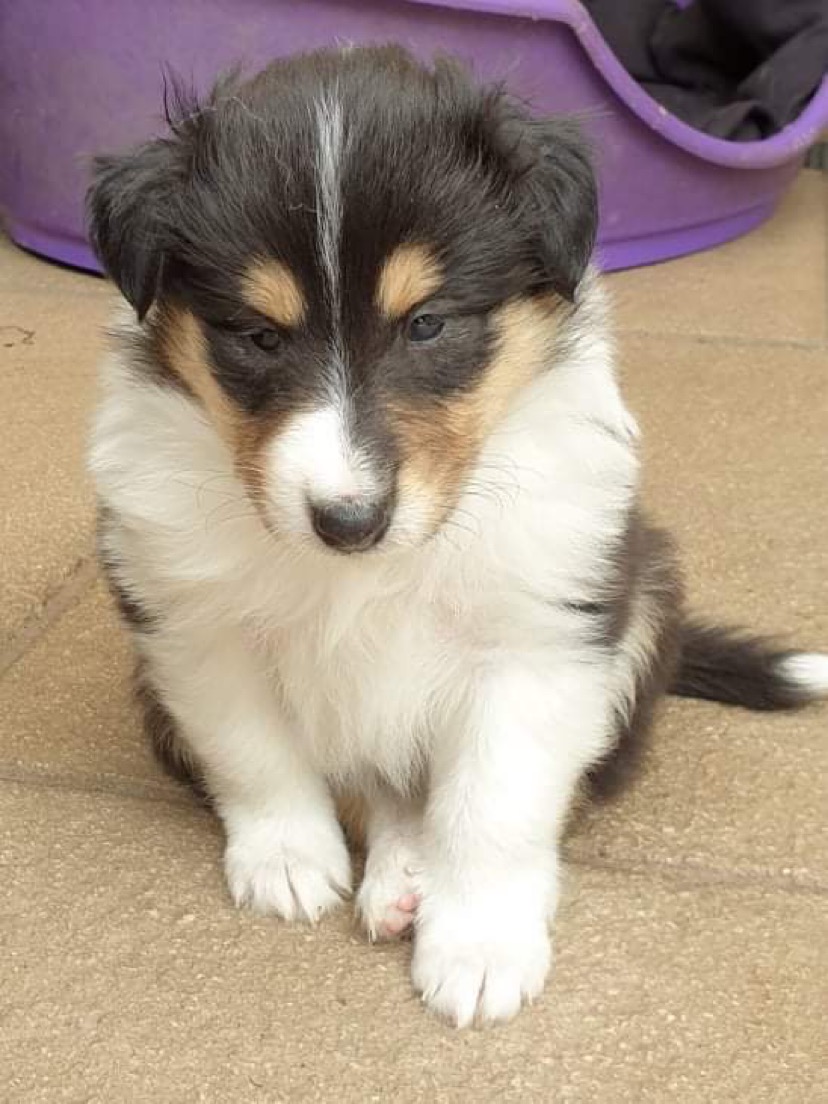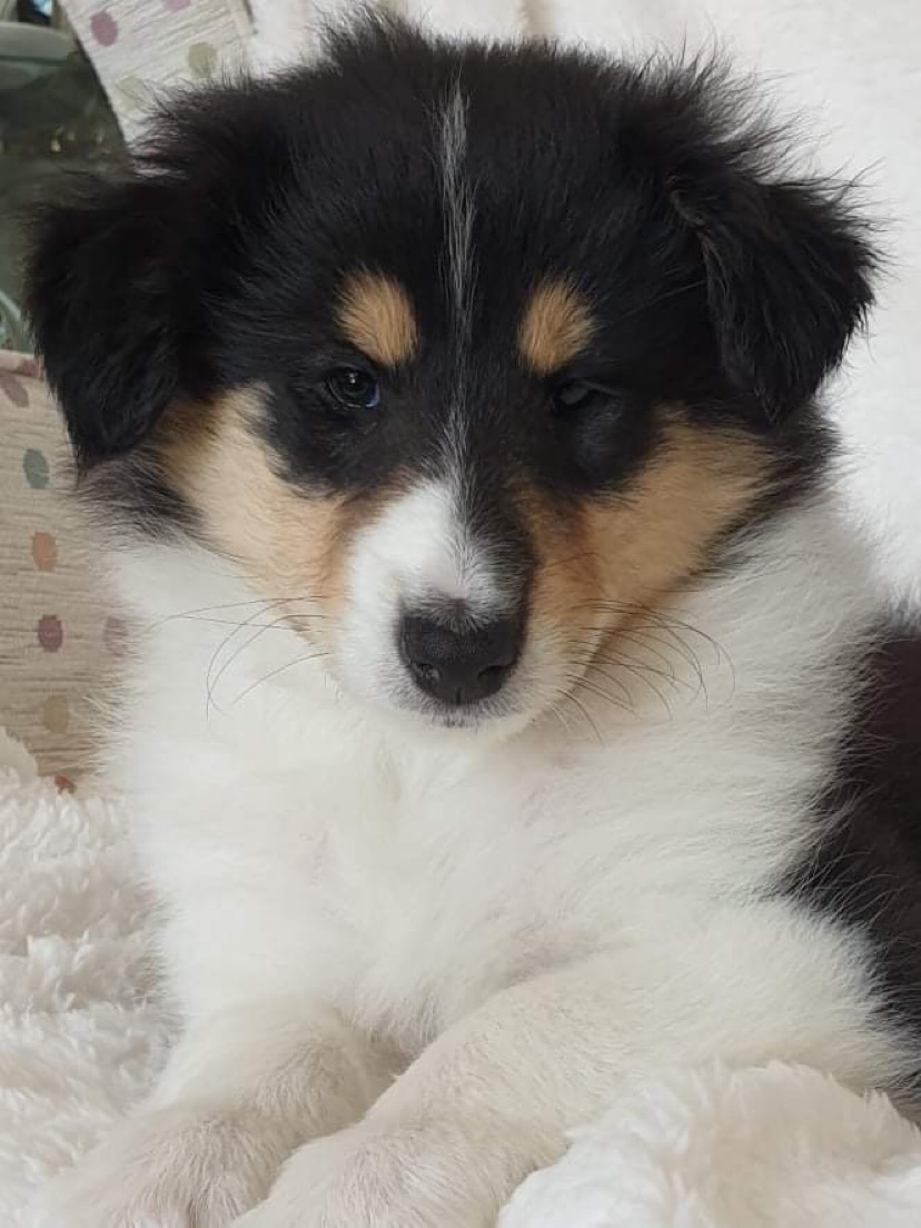 Rain is a tricolour with white feet and a white collar, she has a long tail and has a coal like jet black coat. Her ears are bang on top and she uses them well. Her eyes are almond shaped, and she also has a good neck and top line, she has plenty of drive and covers the ground with ease.