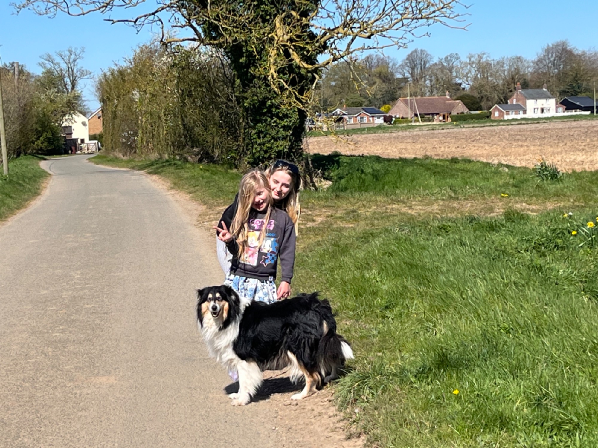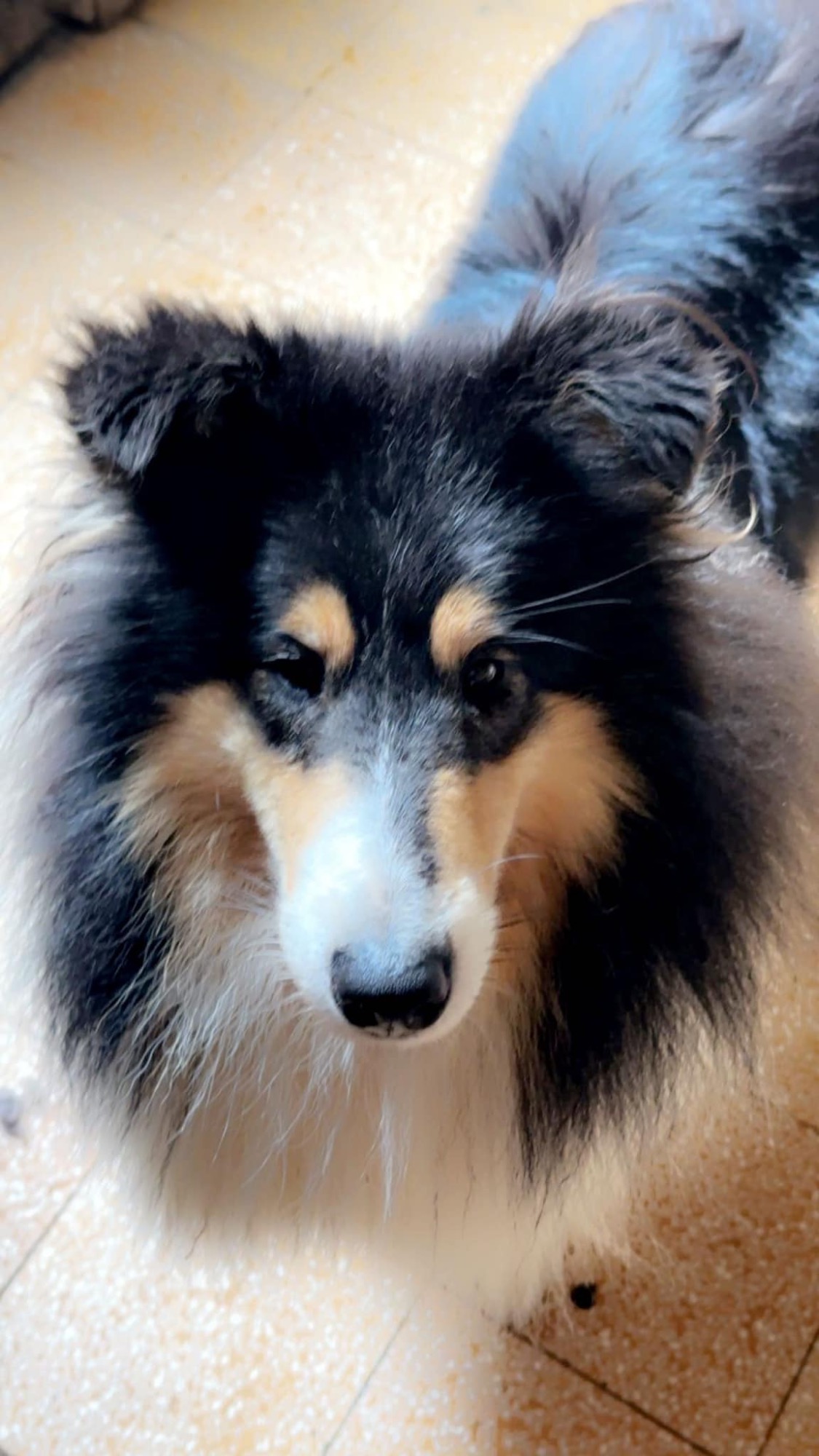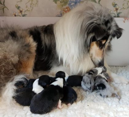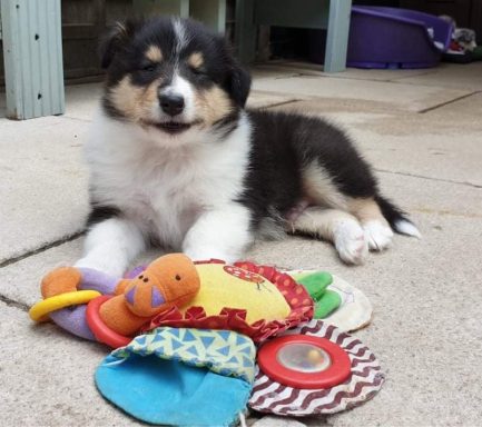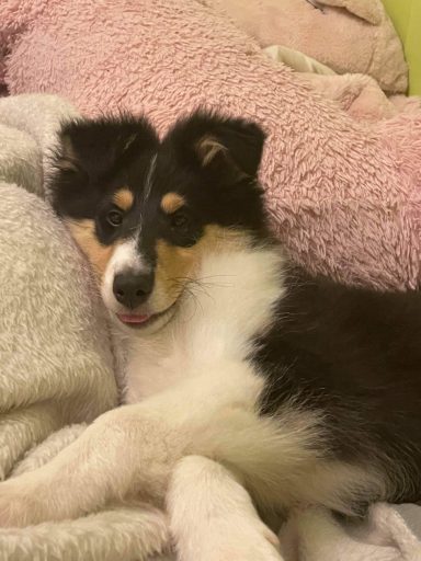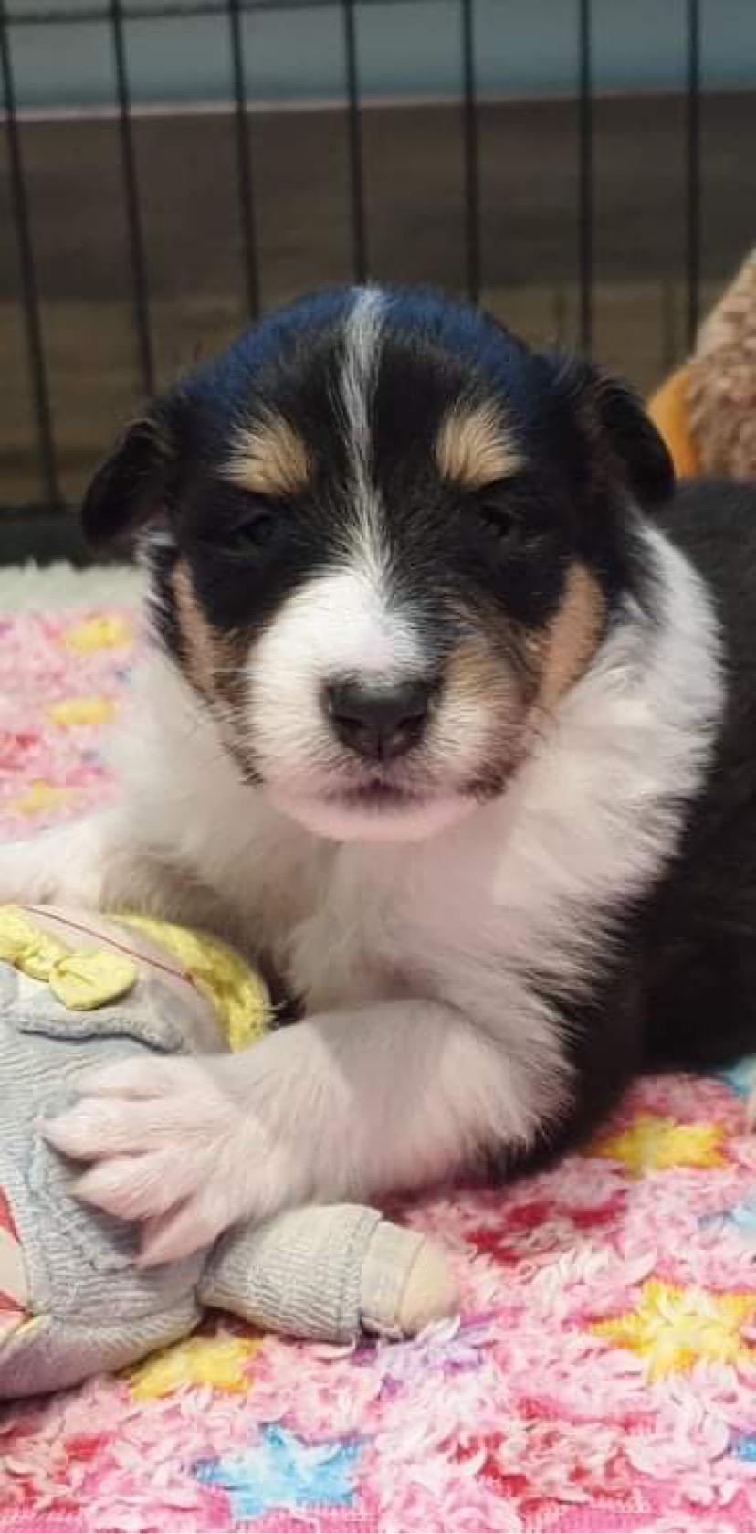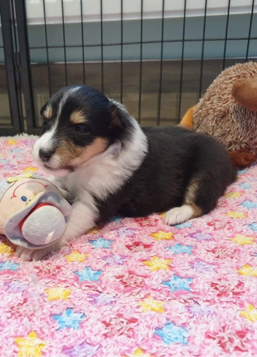Rain is a tricolour with white feet and a white collar, she has a long tail and has a coal like jet black coat. Her ears are bang on top and she uses them well. Her eyes are almond shaped, and she also has a good neck and top line, she has plenty of drive and covers the ground with ease.